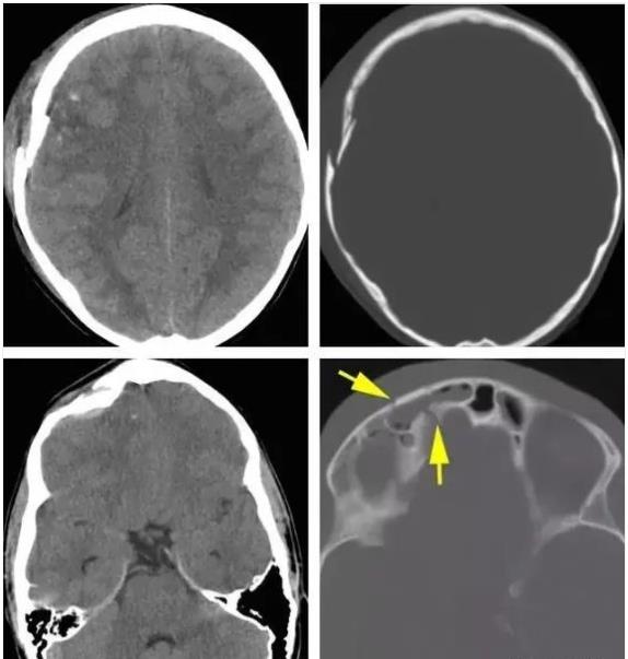 根据形态的不同,可出现凹陷、线状、粉碎性和空洞性等,外伤后颅内气体可提示颅骨骨折。